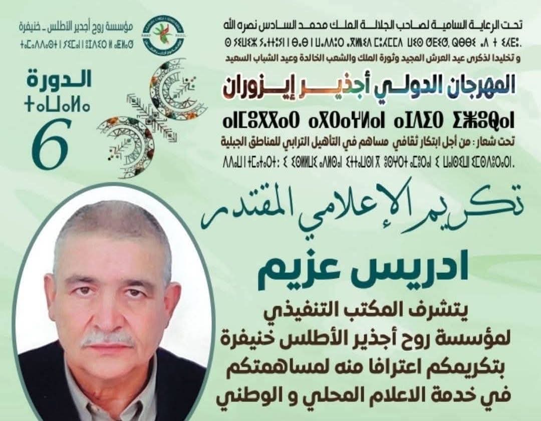 خلال فعاليات الدورة السادسة من المهرجان الدولي أجدير إيزوران، الذي تنظمه مؤسسة روح أجدير الأطلس خنيفرة تحت شعار: «من أجل ابتكار ثقافي مساهم في التأهيل الترابي للمناطق الجبلية»، كان الموعد مع لحظة استثنائية تُوجت بتكريم الإعلامي المقتدر إدريس عزيم، أحد الأسماء البارزة في المشهد الصحفي المغربي، لما قدّمه من عطاءات نوعية في خدمة الإعلام المحلي والوطني.