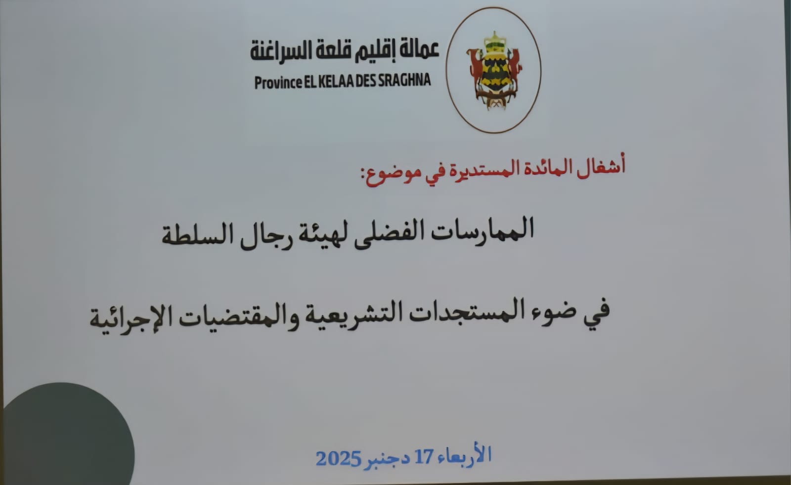 احتضن مقر عمالة إقليم قلعة السراغنة، يوم الأربعاء 17 دجنبر 2025، اجتماعاً تأطيرياً ترأسه السيد عامل إقليم قلعة السراغنة، بحضور كافة رجال السلطة العاملين بالنفوذ الترابي للإقليم، خُصص لمناقشة مستجدات قانون المسطرة الجنائية رقم 03.23 المتمم للقانون 22.01، الذي دخل حيز التنفيذ بتاريخ 08 دجنبر 2025.