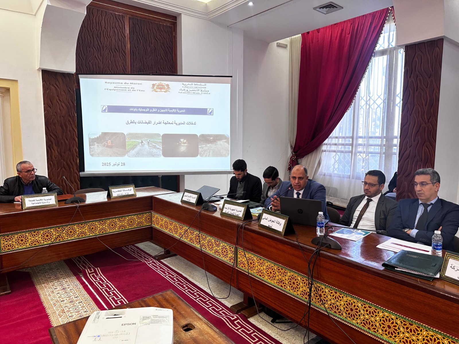 وفي سياق نفسه ، قدم عدد من ممثلي المصالح التقنية والجهوية عروضا تفصيلية ساهمت في إثراء النقاش وتعزيز الرؤية التكاملية لتدبير مخاطر الفيضانات. حيث قام رئيس مصلحة الأشغال والتجهيزات المائية بوكالة الحوض المائي لسبو، والمدير الجهوي للأرصاد الجوية للشمال الشرقي، ومدير وممثل الوكالة الحضرية لتازة تاونات، والمدير الإقليمي للتجهيز ، بعرض مداخلات تقنية سلطوا من خلالها الضوء على الإشكاليات المرتبطة بالفيضانات على مستوى الإقليم.