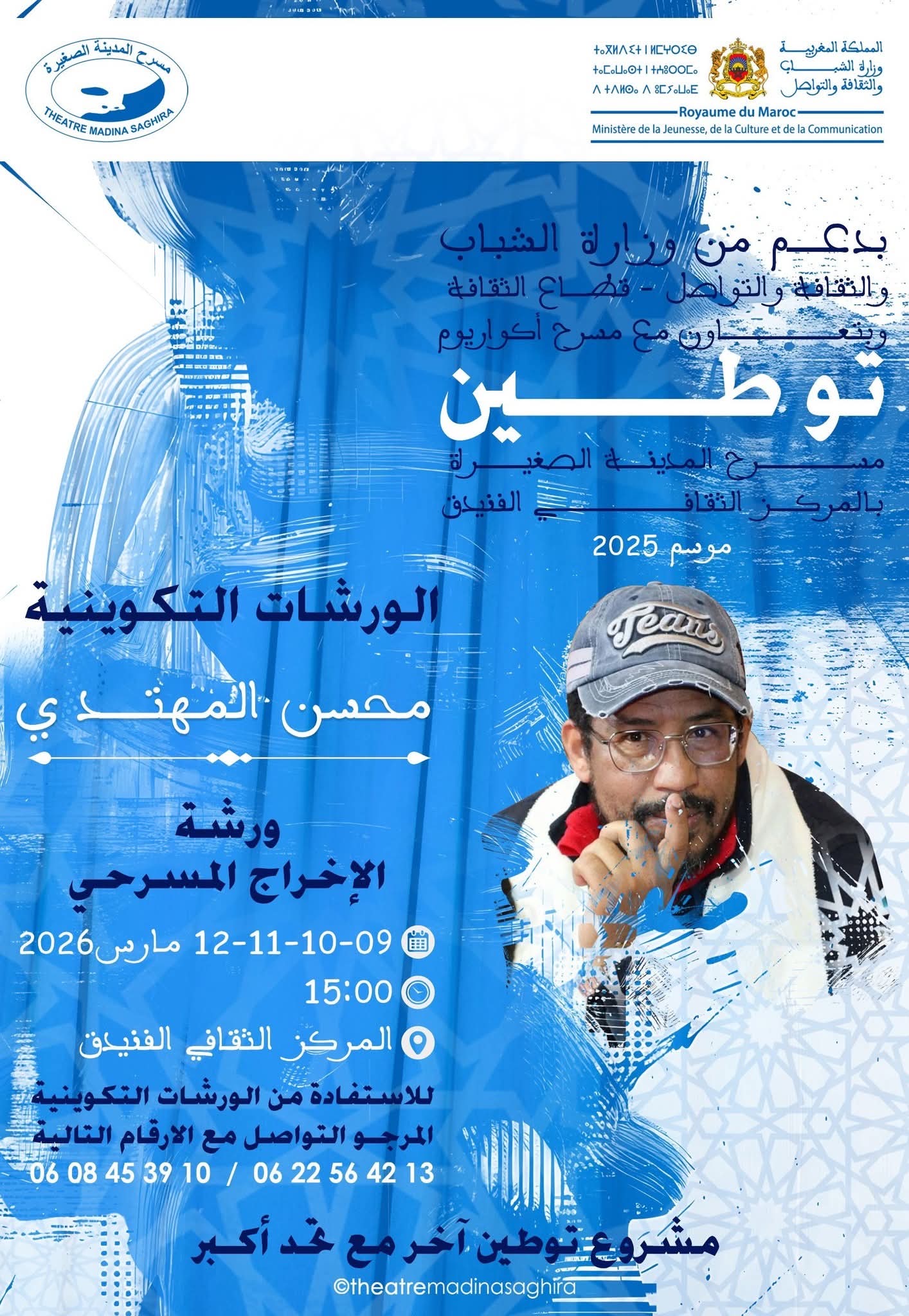 في إطار الجهود الرامية إلى دعم الممارسة المسرحية وتطوير قدرات الشباب المهتمين بالفن المسرحي ، ينظم فضاء الثقافة والتواصل بالمركز الثقافي الفنيدق ، بشراكة مع مسرح المدينة الصغيرة وبدعم من وزارة الشباب والثقافة والتواصل، ورشة تكوينية متخصصة في الإخراج المسرحي يؤطرها الفنان والمخرج محسن المهتدي.