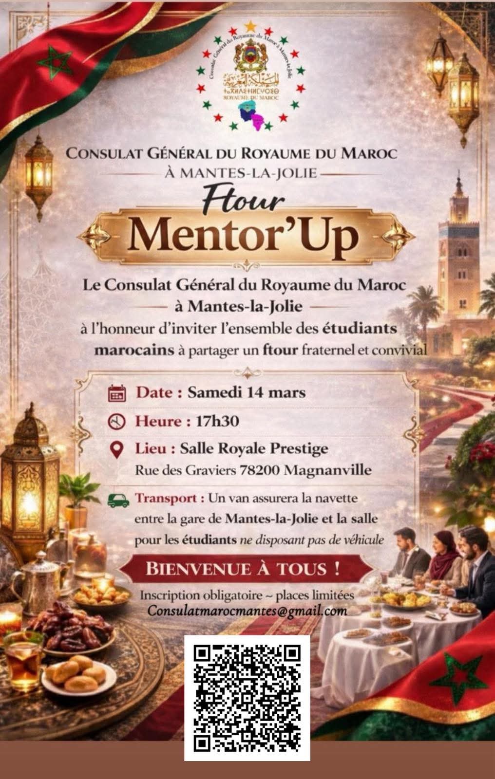 تنظم القنصلية العامة للمملكة المغربية بمانت‑لا‑جولي، يوم السبت 14 مارس الجاري، لقاءً رمضانياً مميزاً لفائدة الطلبة المغاربة المقيمين بفرنسا تحت عنوان “Mentor’Up”، وذلك ابتداءً من الساعة الخامسة والنصف مساءً.