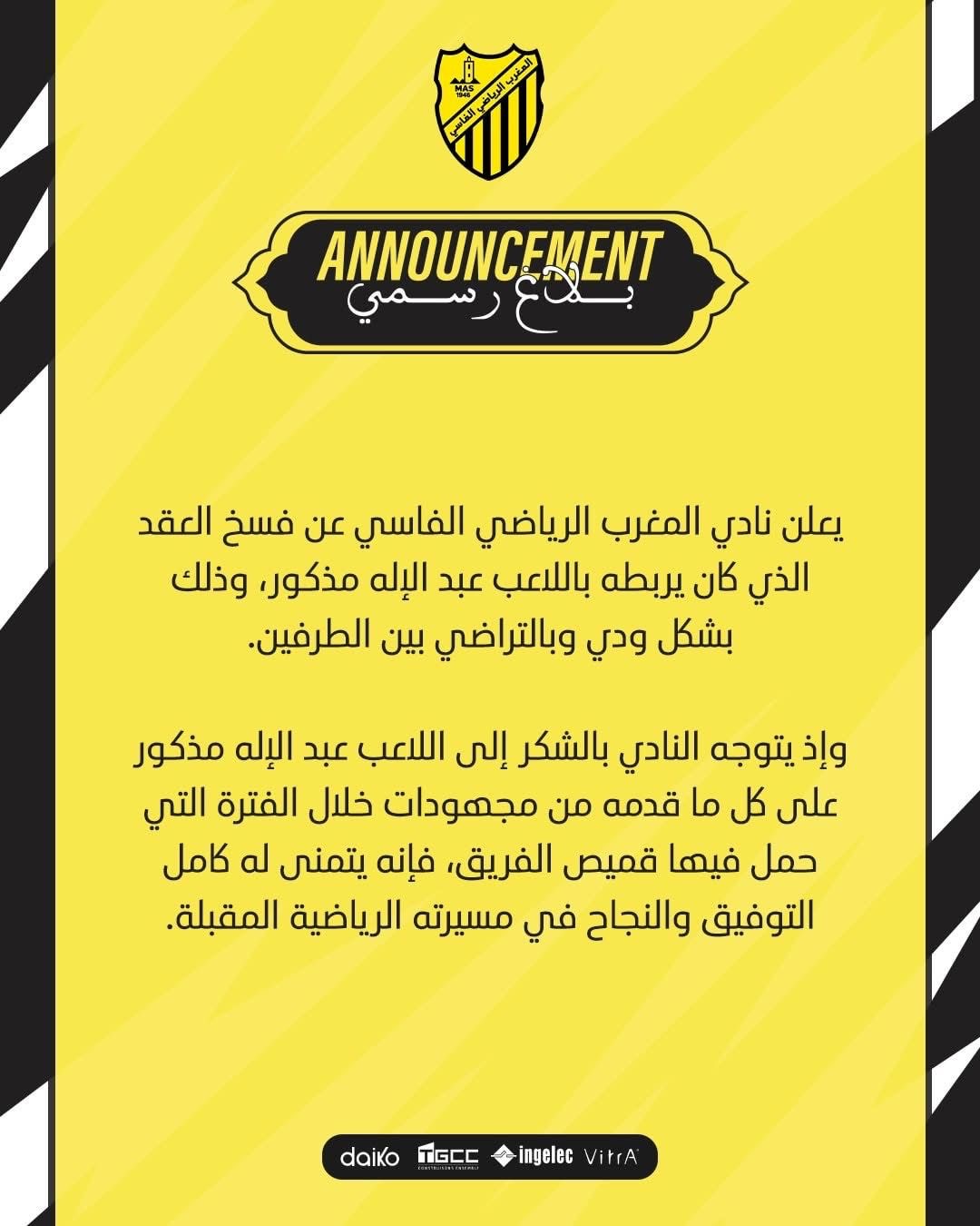 المغرب الفاسي ينهي عقد اللاعب عبد الإلاه مذكور