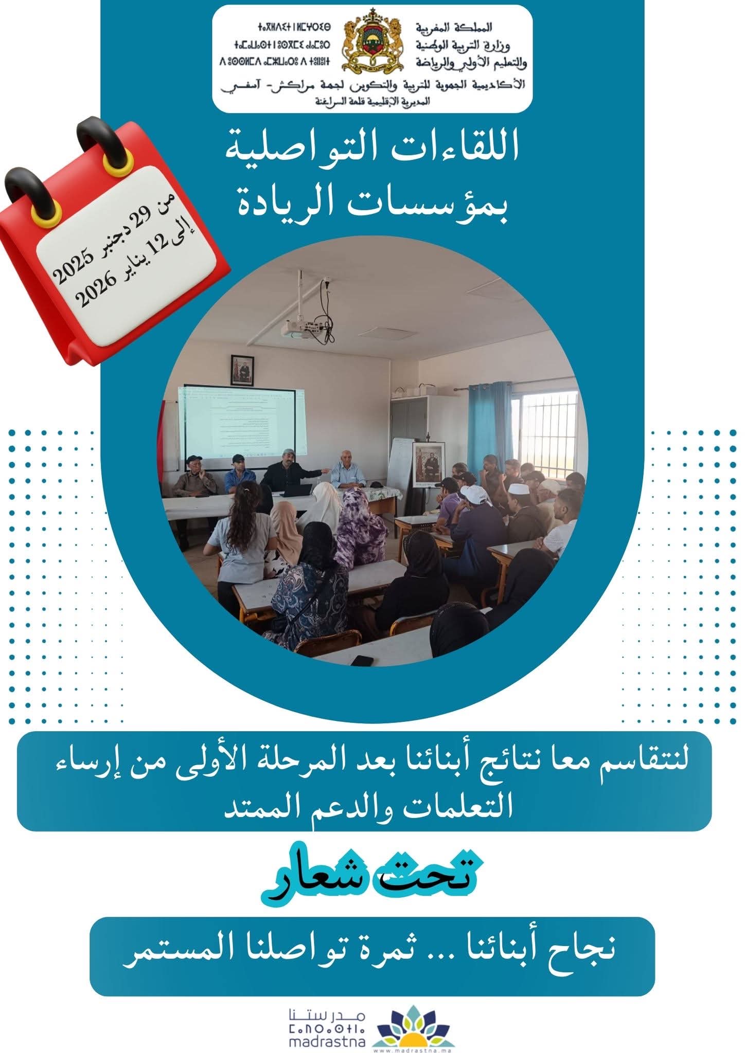 وتندرج هذه المبادرة في سياق تفعيل المحطة الثانية من اللقاءات التواصلية بمؤسسات الريادة للتعليم الابتدائي، وذلك خلال الفترة الممتدة من 29 دجنبر 2025 إلى 12 يناير 2026، تحت شعار معبر يلخص جوهر الرهان التربوي: «نجاح أبنائنا… ثمرة تواصلنا المستمر».