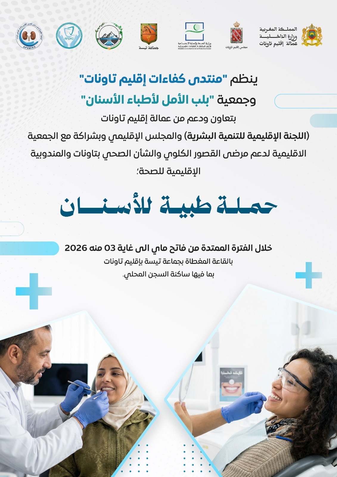 وتندرج هذه القافلة الطبية في إطار البرنامج الوطني لحماية صحة الفم والأسنان، حيث يشرف على تنظيمها منتدى كفاءات إقليم تاونات بشراكة مع جمعية لب الأمل لأطباء الأسنان (Pulpe d’Espoir)، وبتنسيق مع فرع المنتدى بالدار البيضاء، وبدعم من عمالة إقليم تاونات عبر اللجنة الإقليمية للتنمية البشرية، إلى جانب المجلس الإقليمي لتاونات، والمندوبية الإقليمية للصحة والحماية الاجتماعية، فضلاً عن الجمعية الإقليمية لدعم مرضى القصور الكلوي والشأن الصحي.