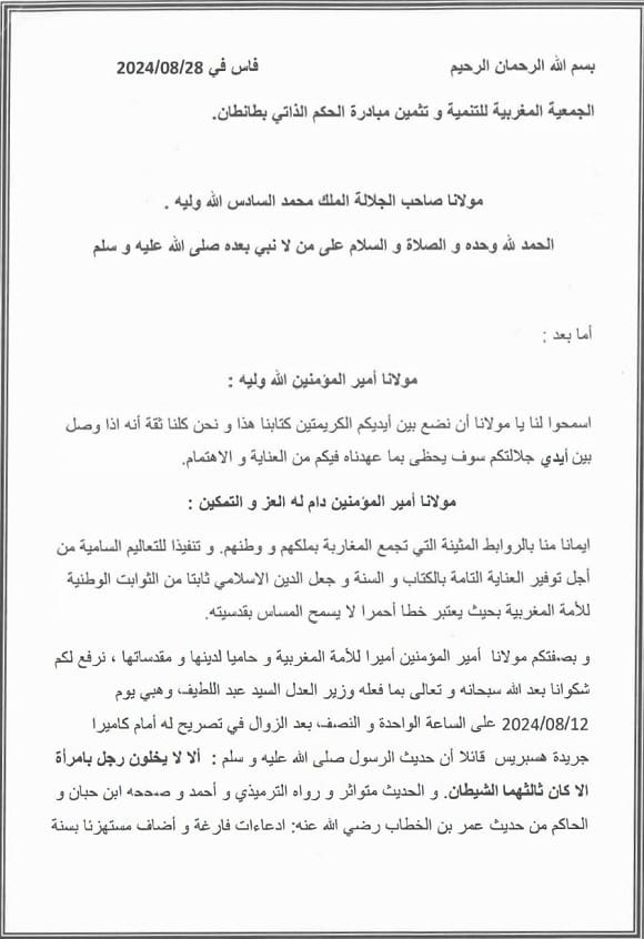 توجهت الجمعية المغربية للتنمية وتثمين مبادرة الحكم الذاتي بطانطان بطلب للملك محمد السادس، تناشده فيه إصدار أوامره السامية لكافة الجهات المعنية بفتح تحقيق شامل حول التصريحات الأخيرة التي أدلى بها وزير العدل، عبد اللطيف وهبي، والتي تضمنت استهزاء بالحديث النبوي الشريف. وتهدف الجمعية من خلال هذا الطلب إلى الكشف عن ملابسات هذه التصريحات ومعاقبة الوزير وفقاً للقانون.