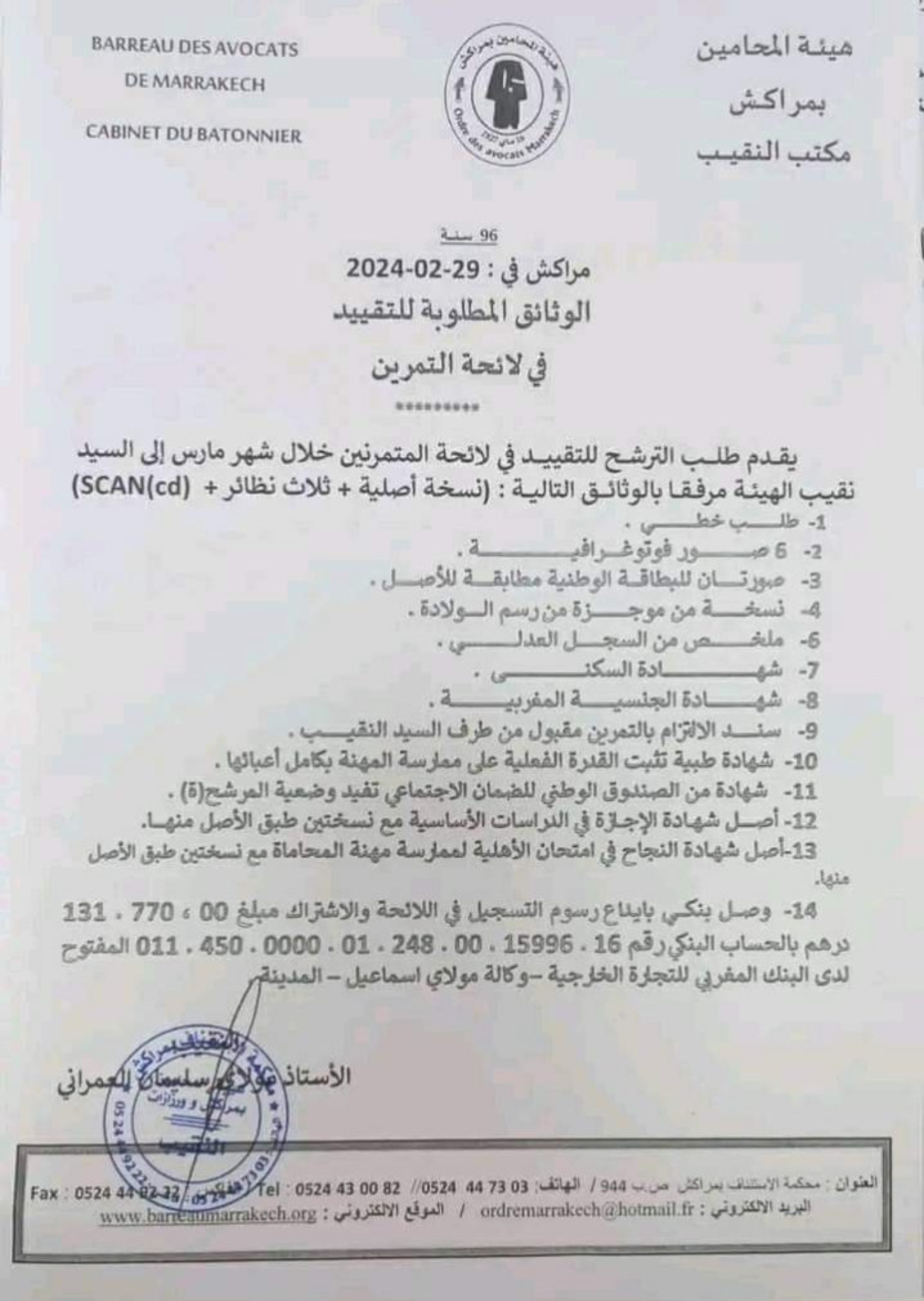 هيئة المحامين في مراكش قامت بزيادة رسوم العضوية للمحامين الجدد من 800 ألف درهم إلى 1.3 مليون درهم. وأوضحت الهيئة في إعلان لها أنه يجب على المتقدمين للعضوية تقديم طلباتهم في شهر مارس إلى نقيب الهيئة، مع إرفاق الوثائق اللازمة بما في ذلك إيصال دفع رسوم التسجيل والاشتراك بمبلغ 1.3 مليون درهم إلى حساب الهيئة البنكي.